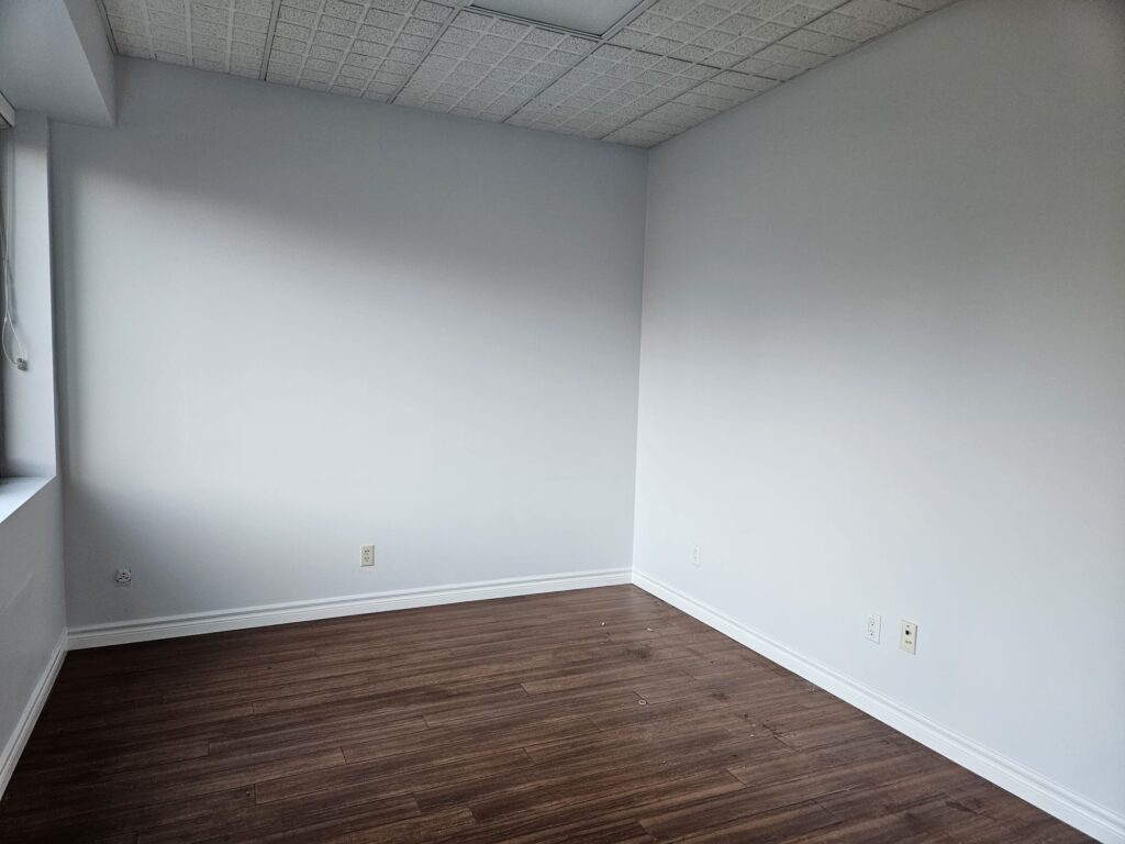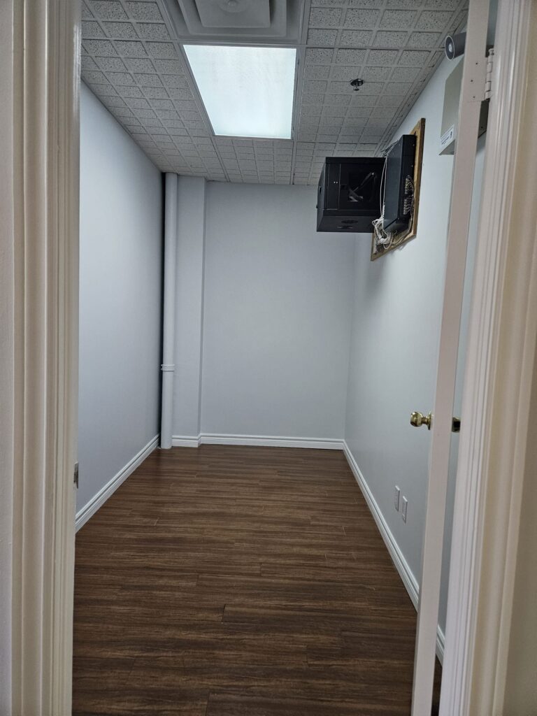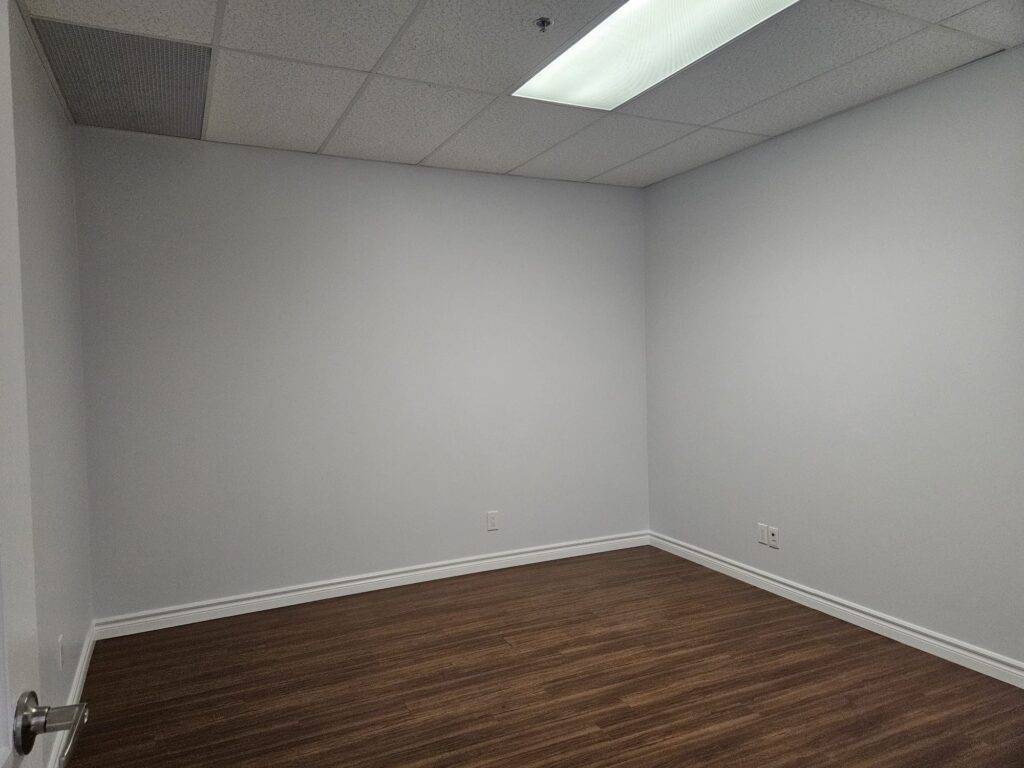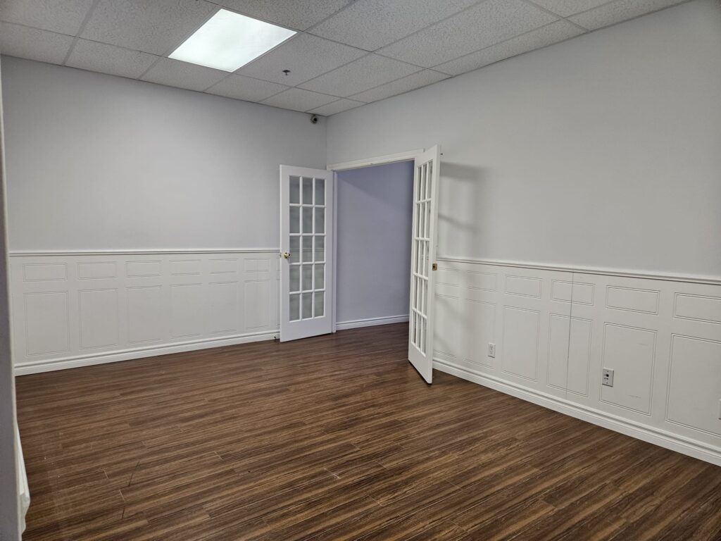 This office space is about 800 sq.ft., and it has an open office and two private rooms.